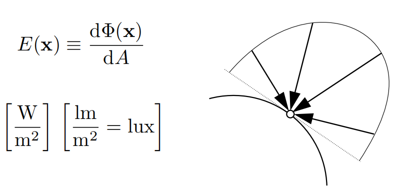 irradiance 为: \( E = \frac{d\Phi}{dA} \)
