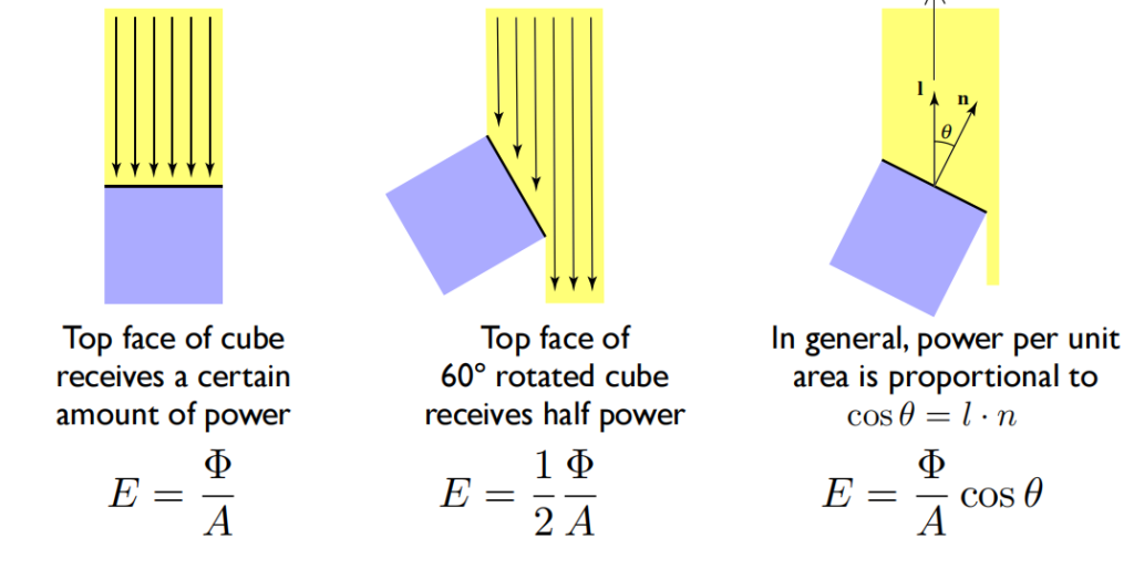 表示入射到表面点处单位面积上的能量,当光线不是垂直入射,需要乘cos入射角 – 光线方向与平面法线的夹角,因为斜入射时同样能量会分摊到更大的表面面积上。可见下例