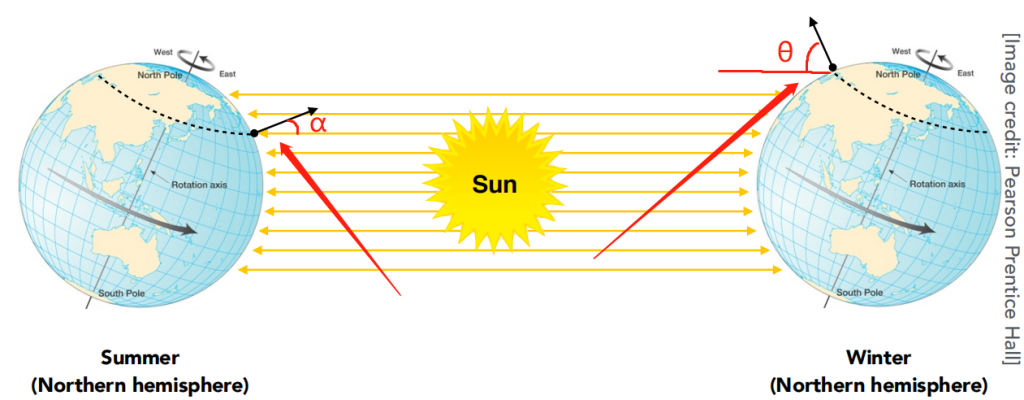例二:地球上不同地方为何有冬夏温差之别? 北半球的某一个纬度上,光线与面法线的夹角不同 \[ \cos\alpha > \cos\theta \] 当地球公转到左图位置时,该纬度附近的一片区域收到的能量多,为夏季;公转到右边位置时则能量少,为冬季。