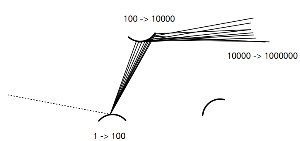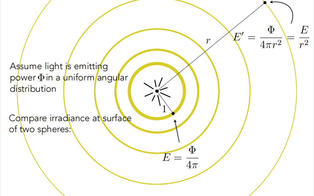 单个光源下,物体上某个着色点接收到的 irradiance \(\boldsymbol{E = \Phi / S_{球}}\),光源的能量均匀向空间中辐射,着色点的辐照度 (irradiance:某个点接受到的来自所有方向的辐射通量) 只有来自该单个光源方向的辐射通量。辐射通量恒定不变,随着距离越远,辐射球的表面积却不断增大,因此球面的每个点分到的能量就少了