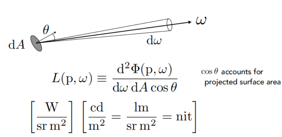 \[ L(p, \omega) = \frac{d^2\Phi(p, \omega)}{d\omega \, dA \, \cos(\theta)} = \frac{dI(p, \omega)}{dA \, \cos\theta} \]