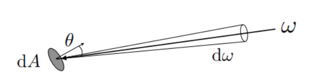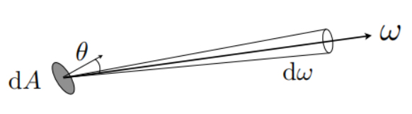 - \(dA\) 是在光源上的一个小的表面,\(d\omega\) 是这个小的表面对应到单位球上的立体角。
