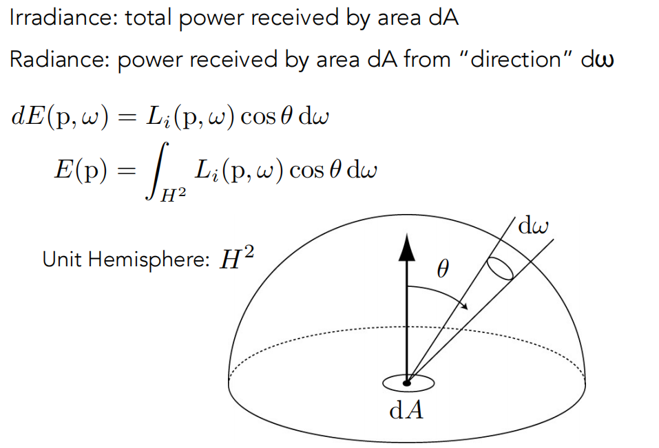 - Irradiance 辐照度: 单位面积dA接收到的通量总和