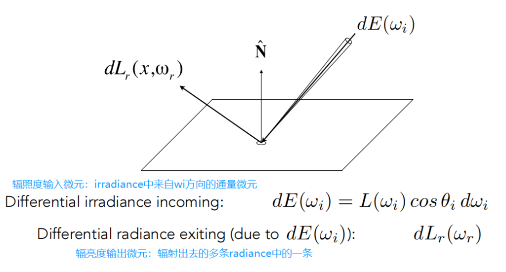 反射的理解:接收到入射光后,自身变成新的光源,向空间中辐射,这样理解有助于利用Radiance和Irradiance解释反射 单位面积 \(dA\) 接收到 \(\omega_i\) 方向来的Radiance,下图中用 \(L(\omega_i)\) 表示,也能理解成辐照度的一个微元 \(dE(\omega_i)\),然后再辐射到四面八方 \(\omega_r\) 中去,这时候辐射出去的又是Radiance(因为反射出去无数多条,power会被均分,而其中特定的一条分到的能量就是一个微元,用 \(dL_r(\omega_r)\) 表示)。
