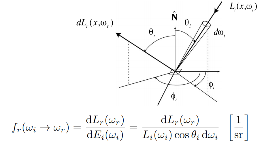 - 函数返回值意义:定义某个点在 ωr 方向的反射光线的能量跟 ωi 方向射入的光线能量的比值