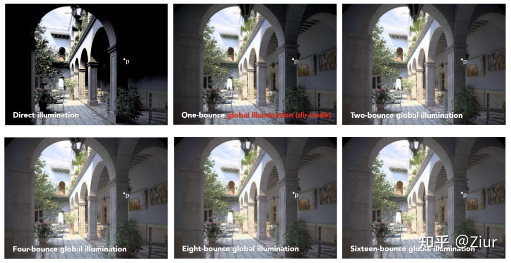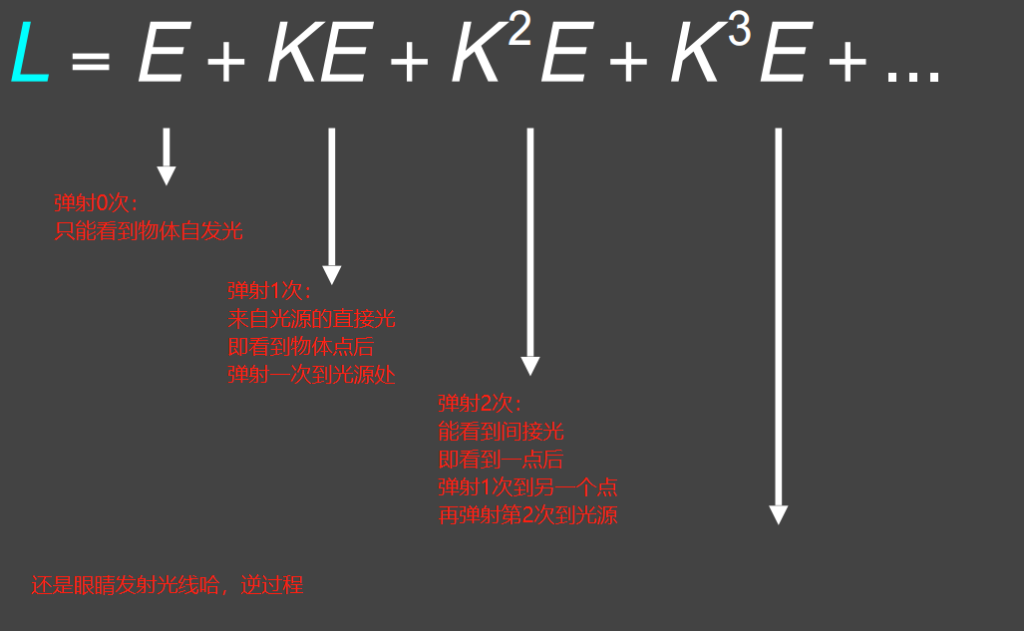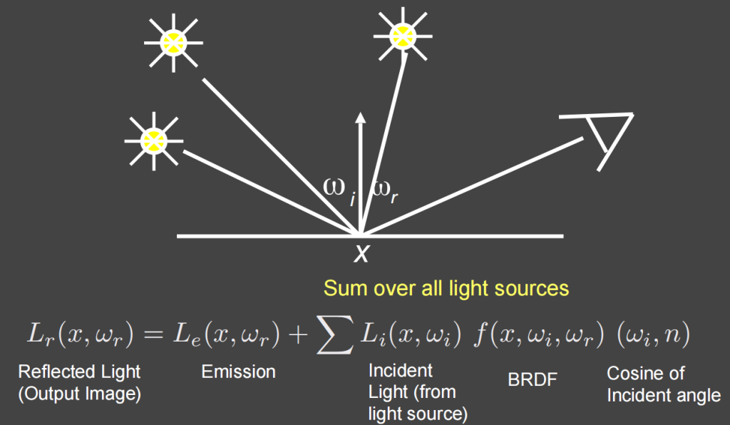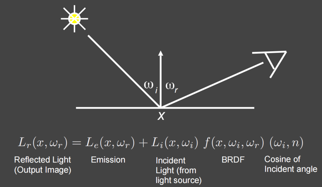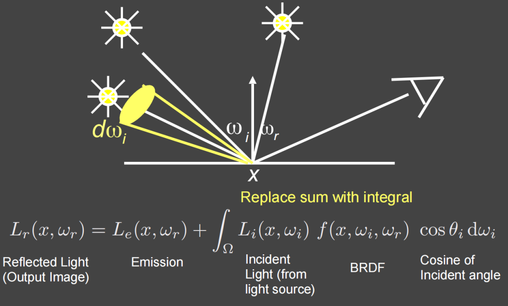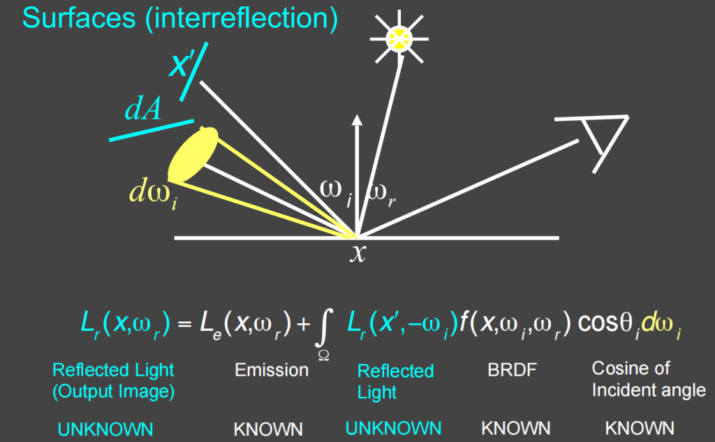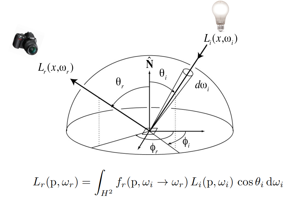 提醒:入射光不止来自光源,也可能是其他物体反射的光。递归思想,反射出去的光Lr也可被当做其他物体的入射光Li。如果只考虑光线弹射一次,那么Li只能是光源,不止一次那就不一定是光源了。