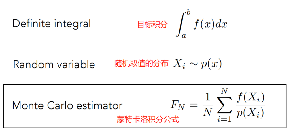- 蒙特卡洛积分可以用任意的pdf,选择什么样的pdf是最好的(重要性采样理论) Monte Carlo integration allows arbitrary pdfs, What’s the best choice? (importance sampling)