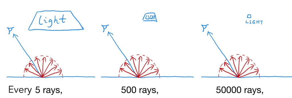 光源较小的时候,如果使用之前的方法对着色点半球范围内的光线均匀采样,由于能打到光源的很少,则很多光线就会被浪费掉 there will be 1 ray hitting the light. So a lot of rays are “wasted” if we uniformly sample the hemisphere at the shading point.