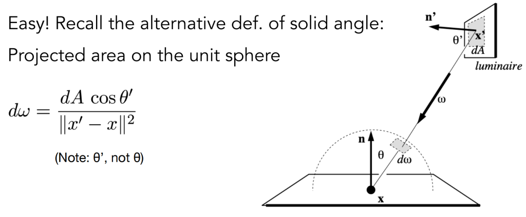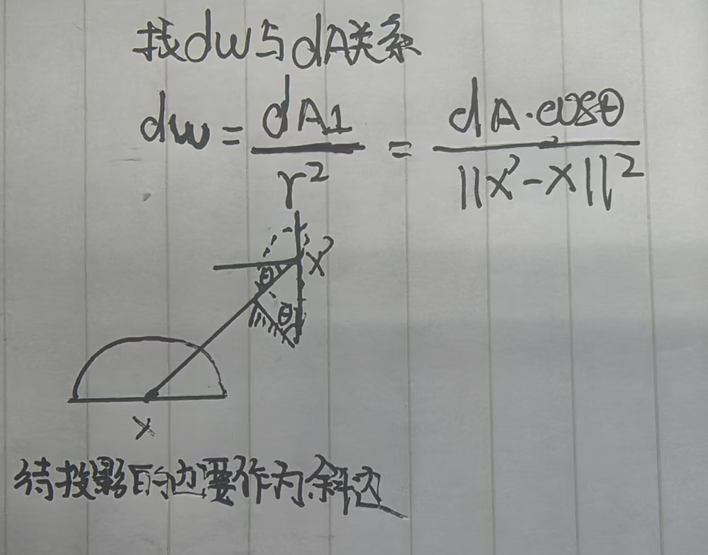 - \(dA \cos\theta’\) 可以得到 \(dA\) 垂直于连线方向的投影面积,再除以两点距离的平方即可得到 \(d\omega\)(立体角定义)