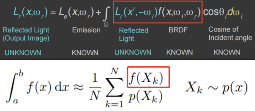 找到 \(dA\) 和 \(d\omega\) 之间的关系后,我们就可以对渲染方程进行改写,此时是在光源进行采样,对光源进行积分,再次利用蒙特卡罗积分进行计算