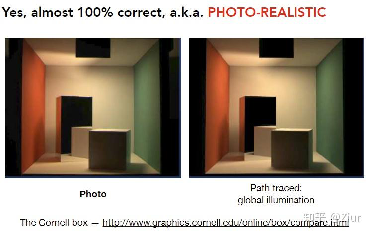 - 学路径追踪你会收获很大,因为路径追踪是几乎100%正确的算法(左:照片,右:渲染)And so learning it will be rewarding also because …