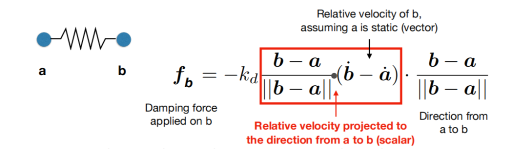 | \[ \frac{\boldsymbol{b} – \boldsymbol{a}}{\|\boldsymbol{b} – \boldsymbol{a}\|} \cdot (\dot{\boldsymbol{b}} – \dot{\boldsymbol{a}}) \] | 左边是单位向量ab,右边是b点相对于a的速度向量,点乘表示把速度投影到ab方向上(注意是标量了!),投影目的是:防止两端相对静止,一个球绕另一个球做圆周运动而出现的阻尼。 |