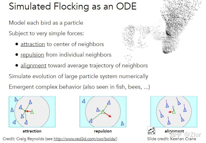 粒子系统也可以描述群体之中的个体,如鸟群中可以定义个体的运动属性,通过粒子模拟来解出来结果,其他还有分子结构、人群等
