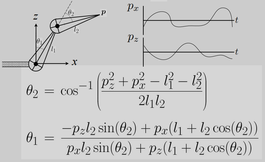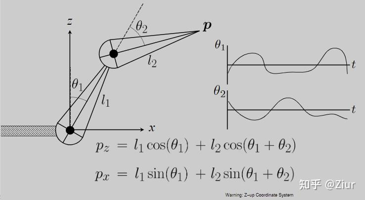 - 计算方法非常简单,说明只要定义好骨骼连接方式,任何时刻只要知道角度,就能算出尖端p应该停在哪里
