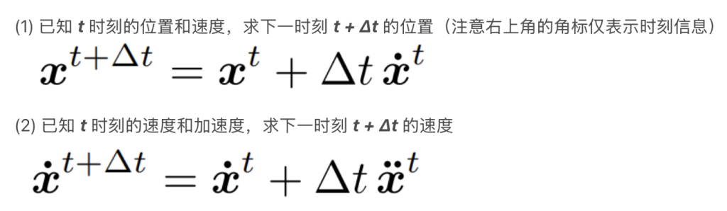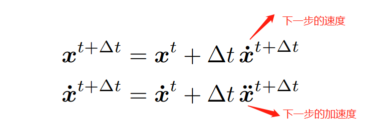$$ \begin{align*} \boldsymbol{x}^{t+\Delta t} &= \boldsymbol{x}^t + \frac{\Delta t}{2} \left( \dot{\boldsymbol{x}}^t + \dot{\boldsymbol{x}}^{t+\Delta t} \right) \\ \dot{\boldsymbol{x}}^{t+\Delta t} &= \dot{\boldsymbol{x}}^t + \Delta t \, \ddot{\boldsymbol{x}}^t \\ \boldsymbol{x}^{t+\Delta t} &= \boldsymbol{x}^t + \Delta t \, \dot{\boldsymbol{x}}^t + \frac{(\Delta t)^2}{2} \ddot{\boldsymbol{x}}^t \end{align*} $$