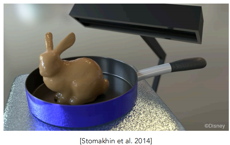 - 现在也有一种混合方法 Material Point Method (MPM):粒子将属性传递给网格,模拟的过程在网格力做,然后把结果插值回粒子 particles transfer properties to the grid, grid performs update, then interpolate back to particles