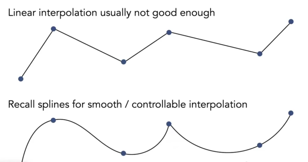 关键帧动画的技术问题在于如何在关键帧之间插值,线性的插值通常不够好,使用曲线/样条来控制能达到比较好的效果 Linear interpolation usually not good enough, Recall splines for smooth / controllable interpolation