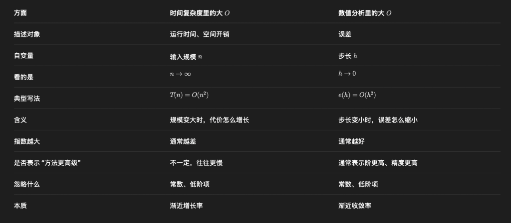 PS:时间复杂度里的大 O 描述“算得多快/多慢”,数值分析里的大 O 描述“误差降得多快”。数学记号一样,但比较的是不同对象,极限方向也不同。
