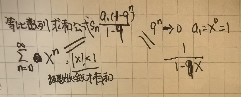 拿到一个函数,判断对某个级数求N阶导或求积分得到相同的形式,同时对等式右侧的级数和进行相同的操作,下面是对等比级数两侧求导的例子