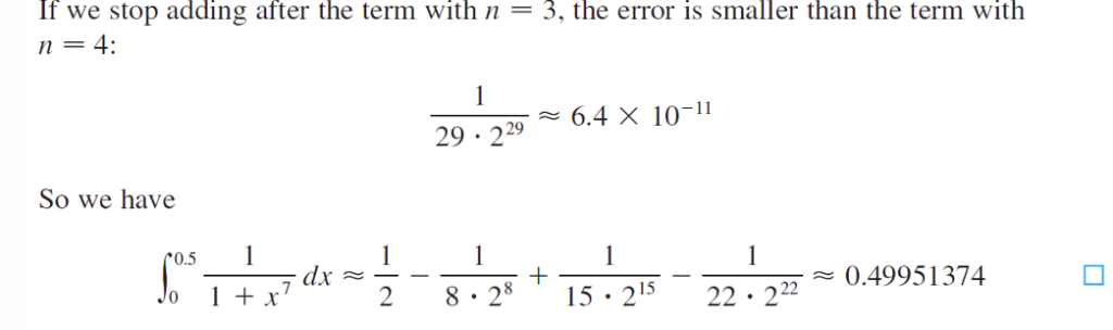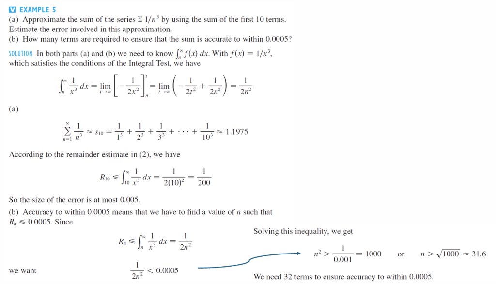 当使用积分测试判断级数 \(\sum_{n=1}^{\infty} a_n\) 的收敛性时,如果级数收敛,我们通常想知道级数的部分和 \(s_n = \sum_{k=1}^{n} a_k\) 与级数的总和 \(s = \sum_{k=1}^{\infty} a_k\) 之间的误差 \(R_n = s – s_n\)。这个结论提供了 \(R_n\) 的上下界: