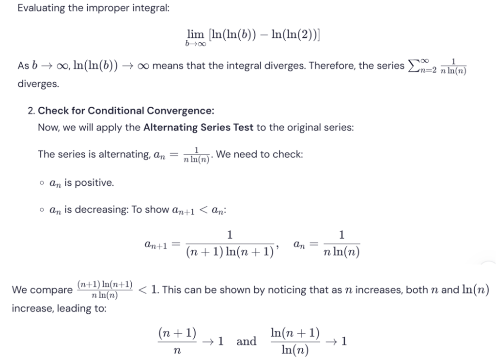 我们知道 \(\sum \frac{1}{n}\) 是发散的(\( p = 1 \) 的 \( p \)-级数)。因此,给定级数通过比较测试发散。