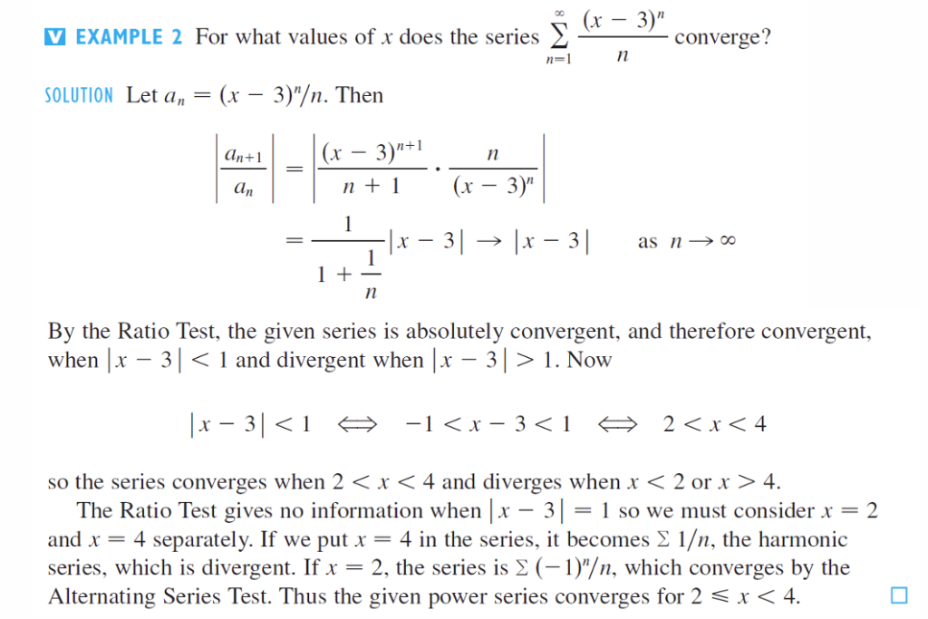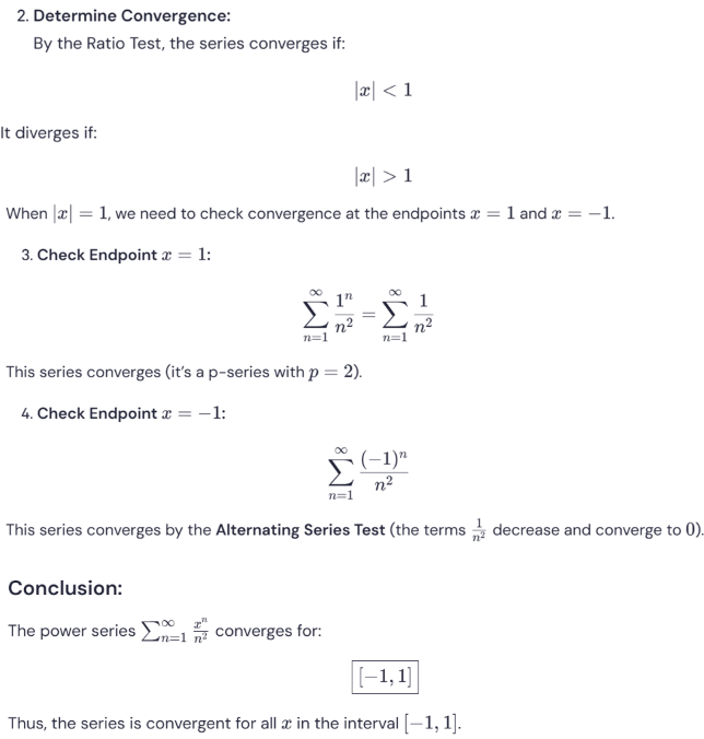 幂级数的收敛区间是级数收敛的所有 x 值组成的区间。在情况 (i) 中,区间仅包含一个点 a。在情况 (ii) 中,区间为 (−∞,∞)在情况 (iii) 中,收敛区间有四种可能性:(a−R,a+R)(a−R,a+R][a−R,a+R)[a−R,a+R]