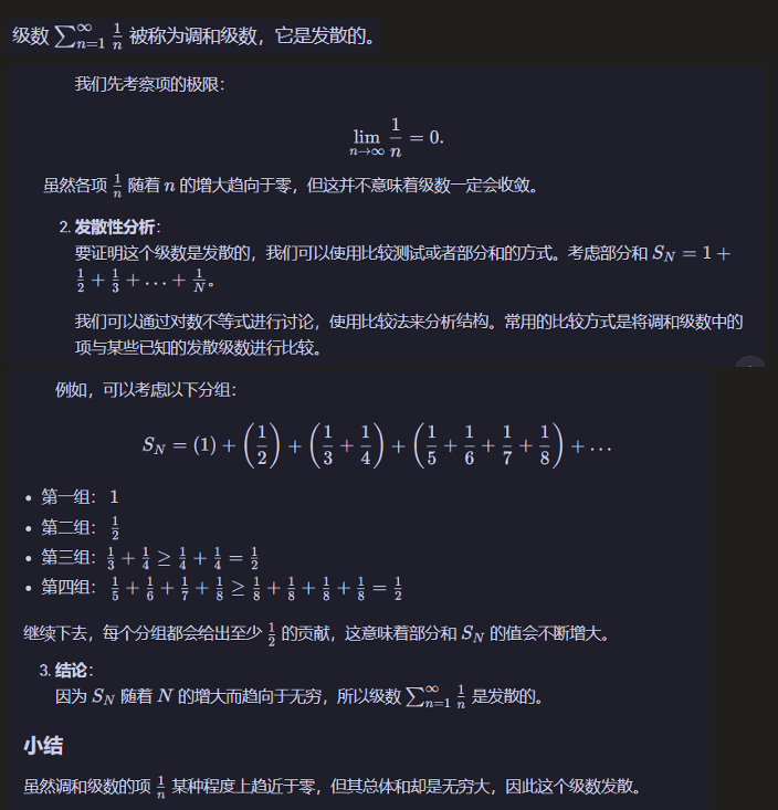 级数的极限为0,并不意味着级数的和一定为0。级数的和取决于所有项的累积效果,即使每一项都趋于0,它们的累积和仍可能趋近于一个非零的有限值,甚至可能发散到无穷大,比如调和级数:序列的极限趋于0,但是级数并不收敛,级数和为无限大。更常用的是其逆否命题