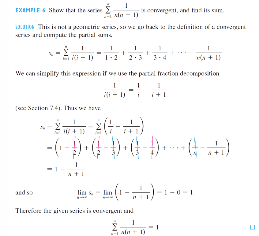 该例子中,先将数列分式分解为2项,利用正负将中间项抵消,剩下首项和末项进而得到求和公式。用定义和更常用的是从定义推导出级数收敛的必要条件