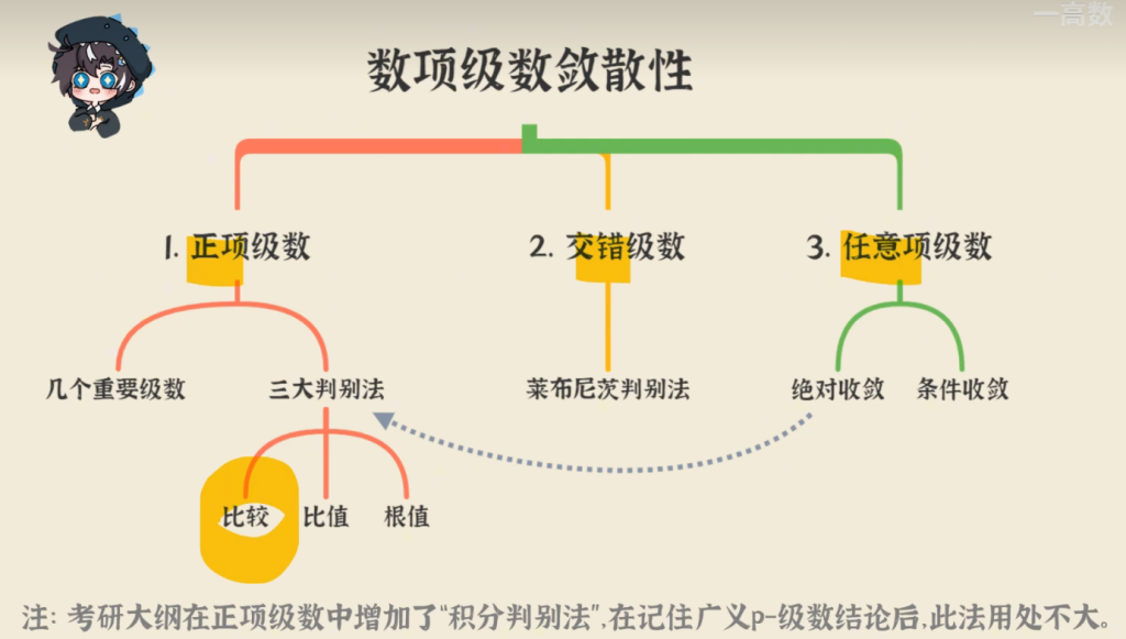 不建议按照特定顺序应用一系列检验,直到其中一个最终有效。那将是时间和精力的浪费。相反,与积分一样,主要策略是根据级数的形式对其进行分类