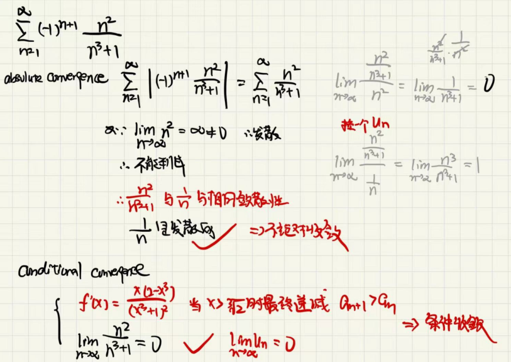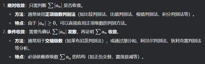 - 收敛包括绝对收敛和条件收敛,两个在收敛的前提下只有一个成立