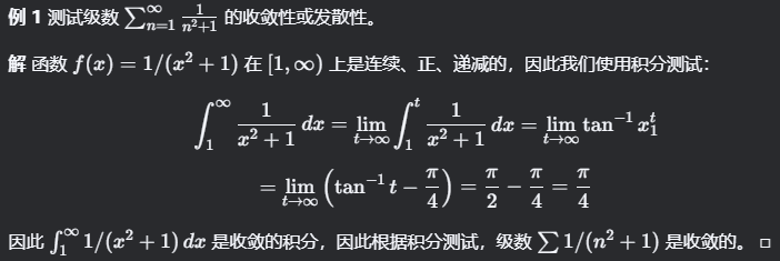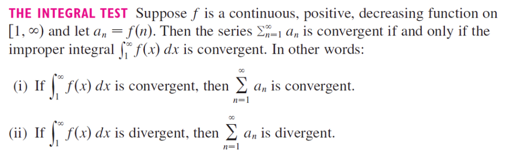 8. 如果 \( a_n = f(n) \),其中 \( \int_1^\infty f(x) \, dx \)易于计算,则积分检验是有效的(假设该检验的假设成立