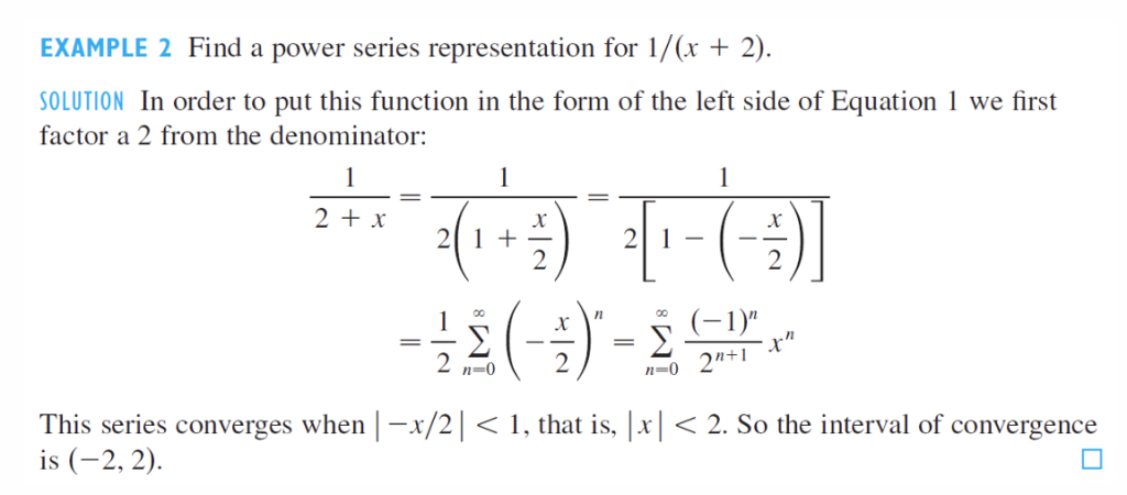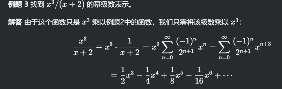 我们知道经典的几何级数展开公式是: \[ \frac{1}{1 – r} = \sum_{n = 0}^{\infty} r^n \quad 当\vert r \vert < 1 \] 所以我们想把\(\frac{1}{x + 2}\)化成这个“\(1\)减去 something”的形式: