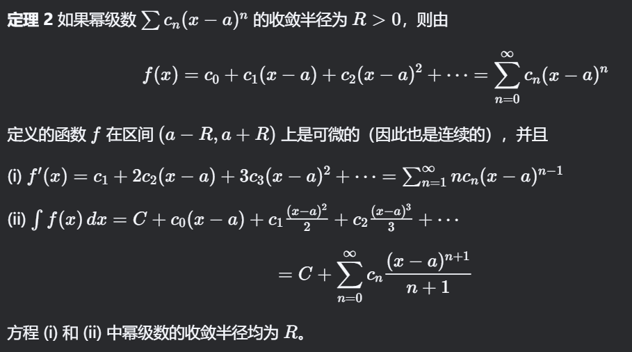 幂级数的和是一个函数 \( f(x) = \sum_{n=0}^\infty c_n (x – a)^n \),其定义域是级数的收敛区间。对用幂级数表示的函数进行微分和积分,等价于对级数中的每一项进行微分或积分,就像我们对多项式积分和求导的操作