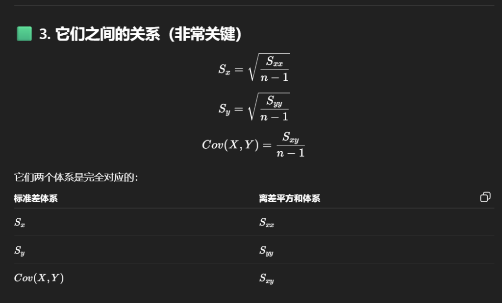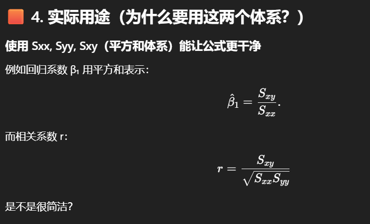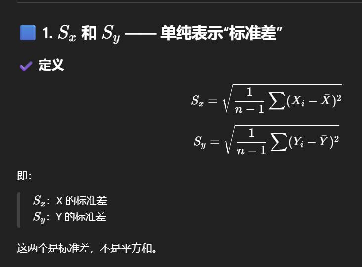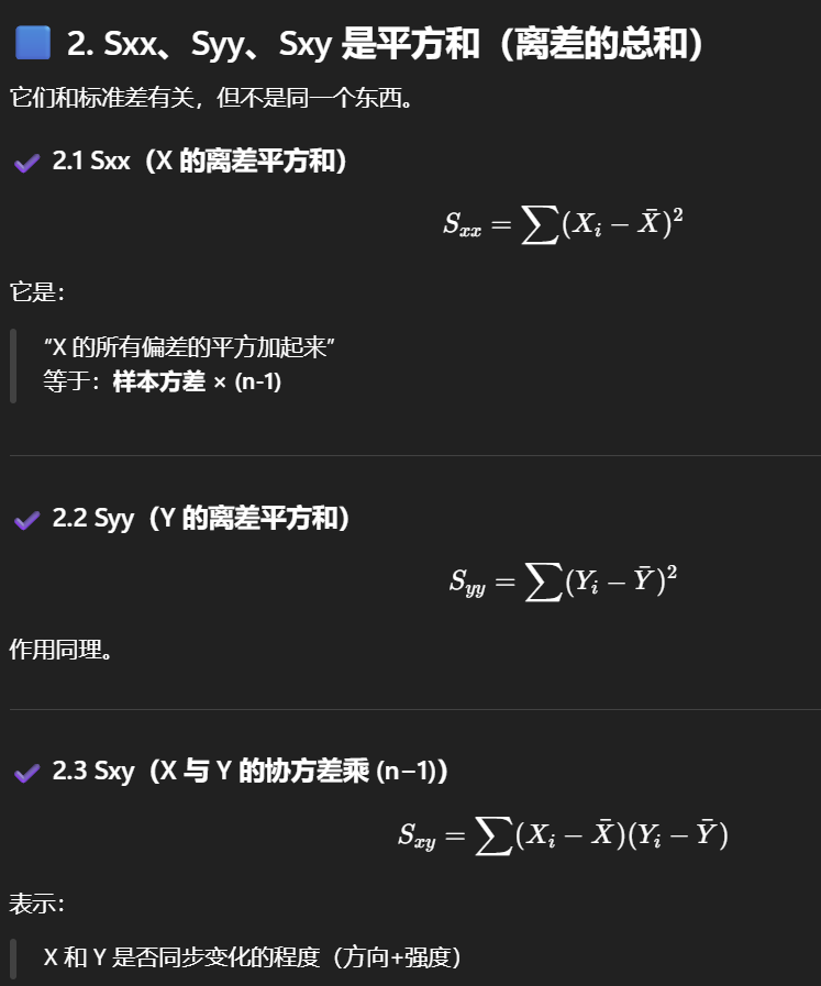 | \(S_{XY}\) | 自变量 x 与因变量 y 的离均差乘积和 | \(\sum (x_i – \bar{x})(y_i – \bar{y})\) | 衡量 x 与 y 之间的线性关联方向与程度 |