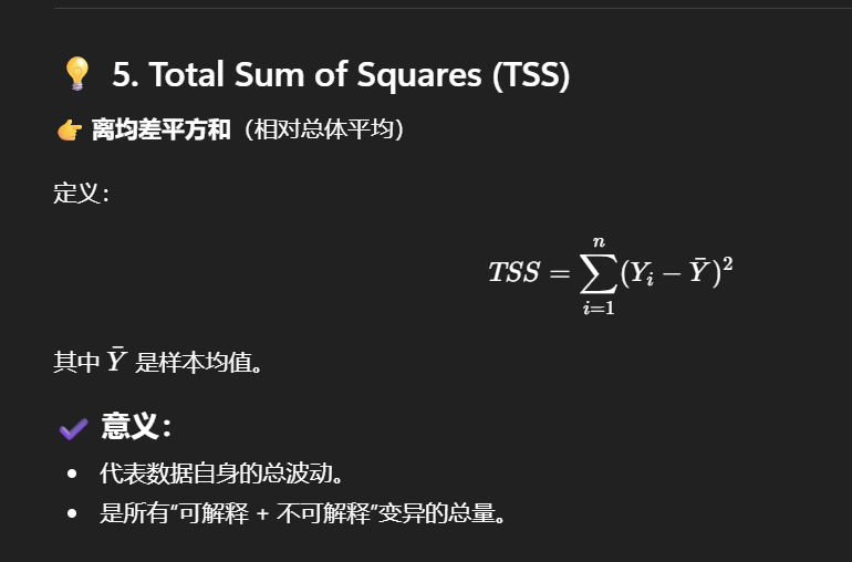 | \(S_{YY}\) | 因变量 y 的离均差平方和 | \(\sum (y_i – \bar{y})^2\) | 衡量因变量 y 自身的变异(离散)程度 |