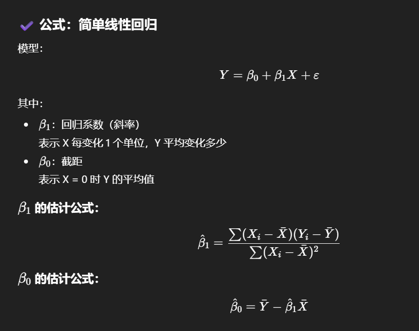 - 在简单线性回归中,因变量也被称为响应变量,自变量也被称为预测变量