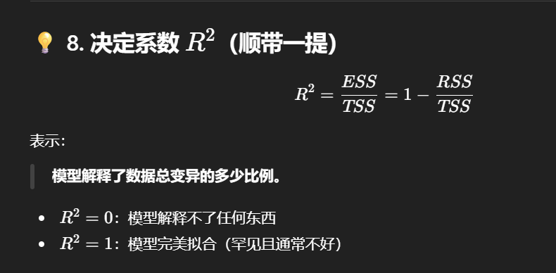 决定系数,通常称为\(R^2\) ,其含义是衡量 “模型解释了多少 Y 的波动”