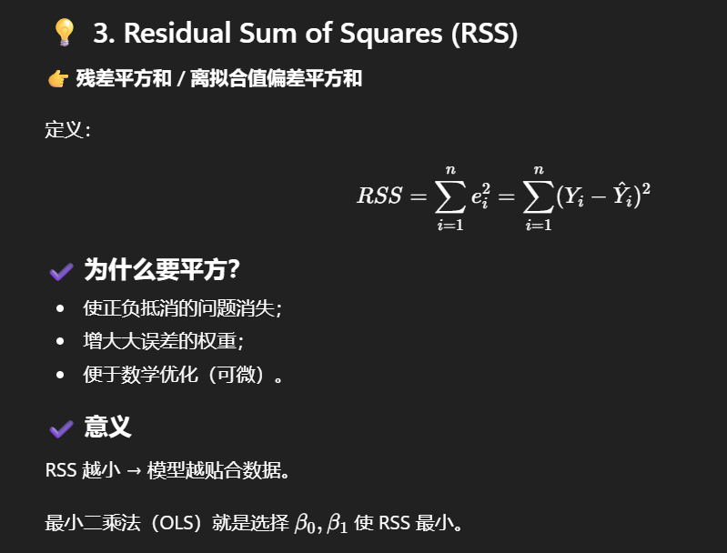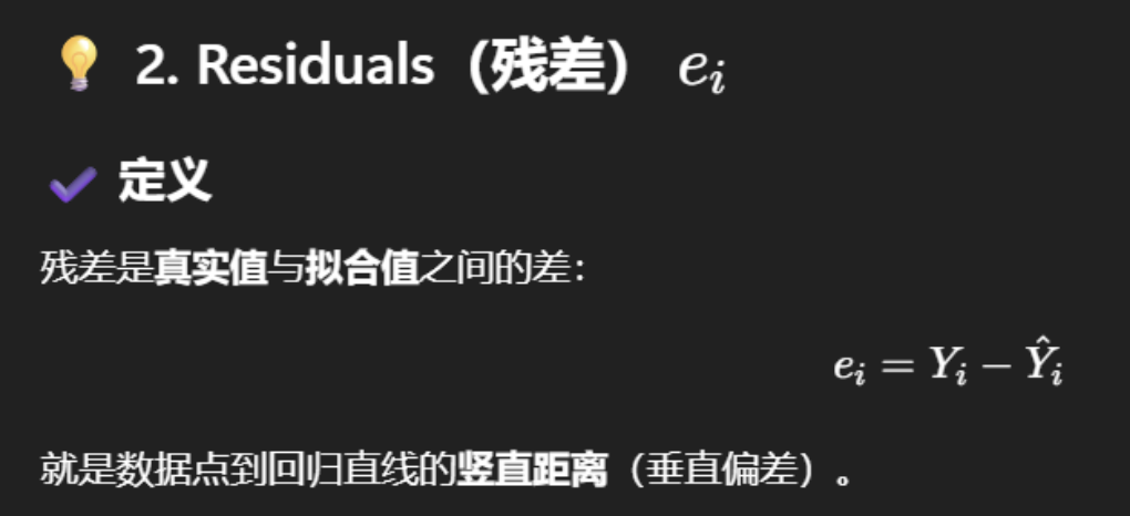 残差平方和,即数据点到直线的垂直偏差(称为残差)的平方和,可表示为: