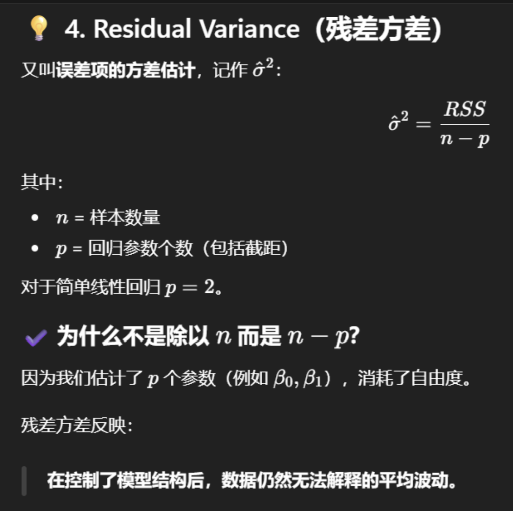 \(s^2 = \frac{1}{n-1}\sum (y_i – \bar{y})^2\):是 ** 用样本估计 “总体y的方差”** 的公式。