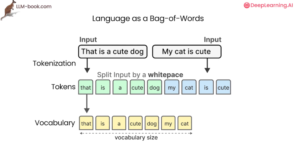 最终将每个离散的词元映射为包含语义信息的连续低维向量(词袋模型的维度由整个词汇表的词数量决定,因此呈现高维稀疏;而词嵌入的维度是人为预设的相关词元固定向量长度,与词汇表大小无关,因此是低维稠密)