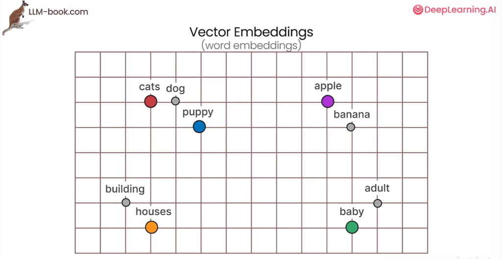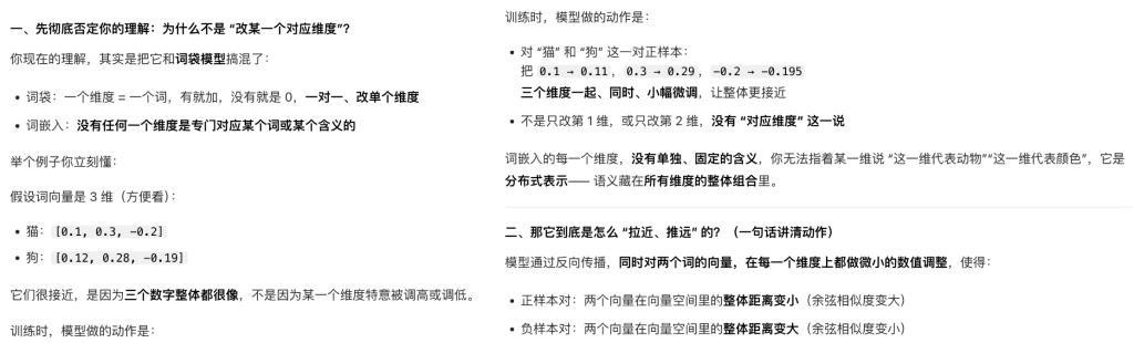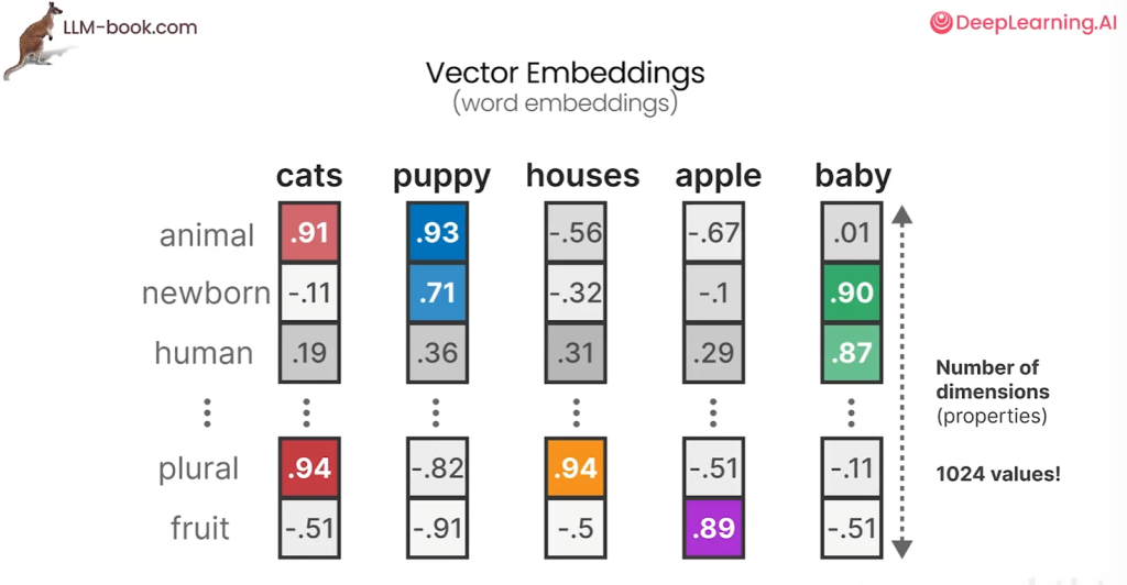 每个单词被表示为一串高维数字(比如 1024 维),这些数字是模型通过复杂计算自动学到的 “语义特征”,语义相近的单词,它们的数字向量会彼此靠近;语义不同的单词,向量则相距较远