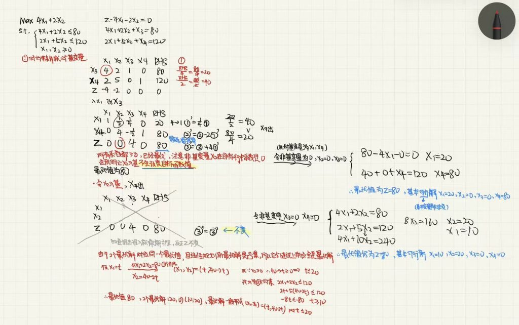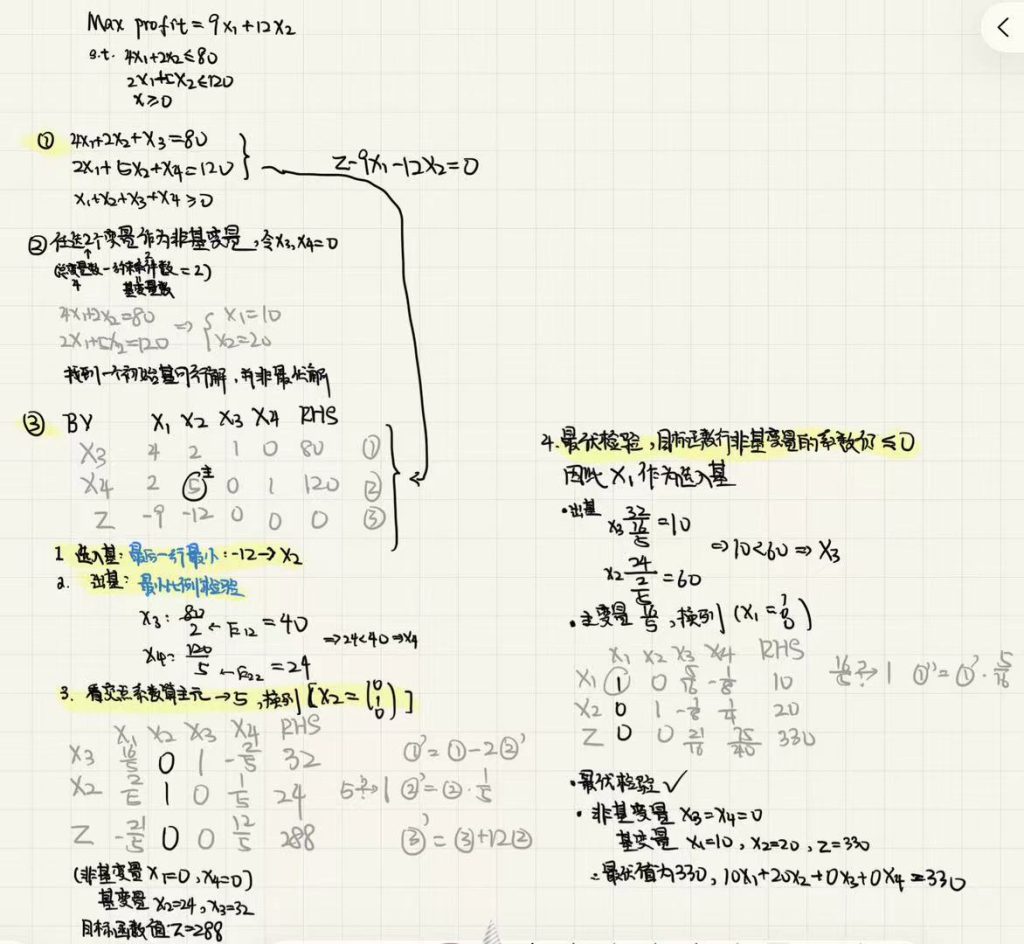 初始化:初始基可行解为(0,0,80,120),此时目标函数值Z=0。该解并非最优解,因为提高x1​或x2​的取值均可提升目标函数值。