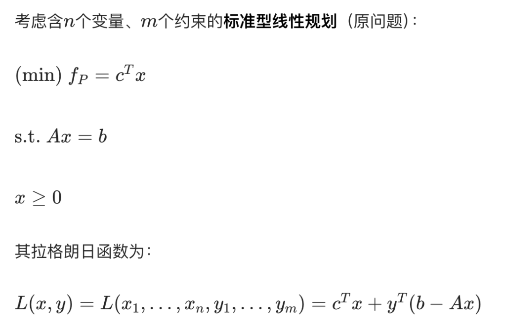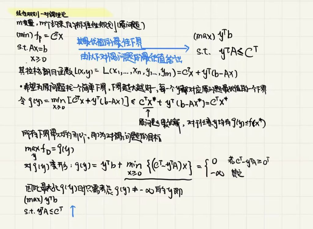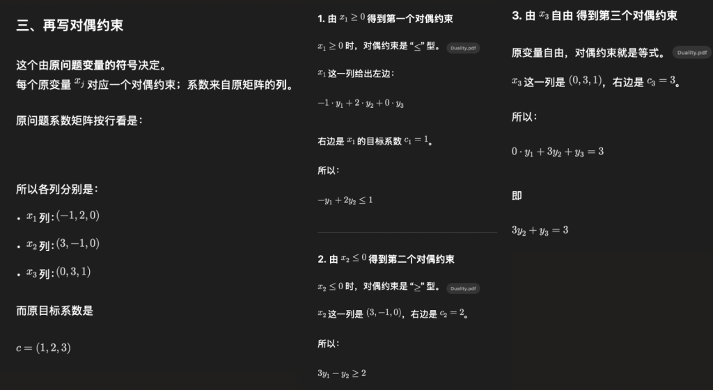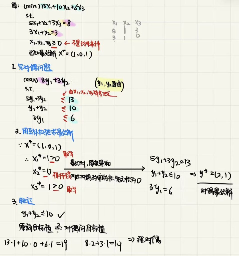 • 约束系数矩阵转置(如对偶第一个约束系数 = 原问题x1​的系数)