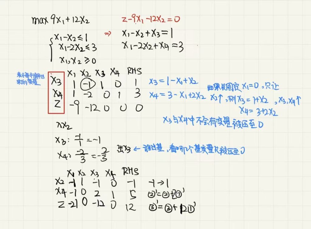 为上述线性规划模型引入松弛变量x3​和x4​,将模型转化为标准型(所有约束为等式、所有变量非负):