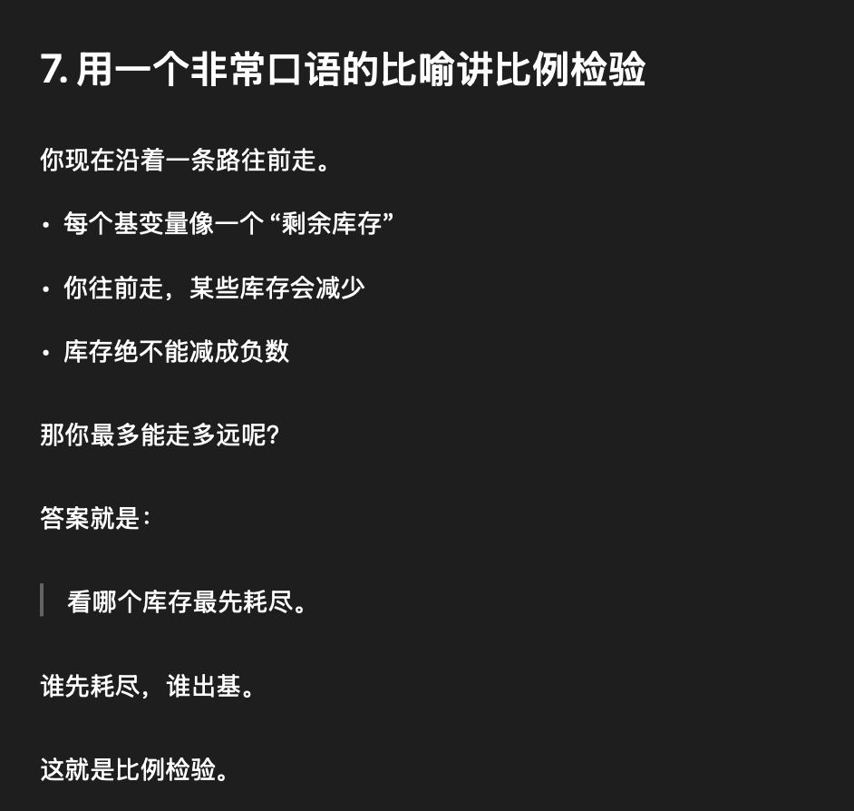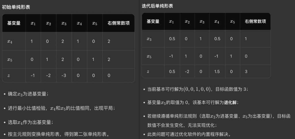 • 平局情况:有两个变量同时顶到墙。这说明你走到的位置,正好卡在一个“更尖的角”上,多个约束同时紧绷。这时如果你随便挑一个出基,数学上可以继续,但可能出现:基变了,但是你的人其实没挪地方,于是这一轮枢轴变换之后,目标函数值可能一点没改善,陷入死循环
