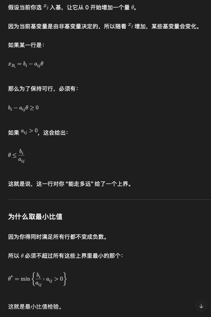 谁最先被压到 0,谁就成为“卡住你”的那个约束,那个变量就必须出基。