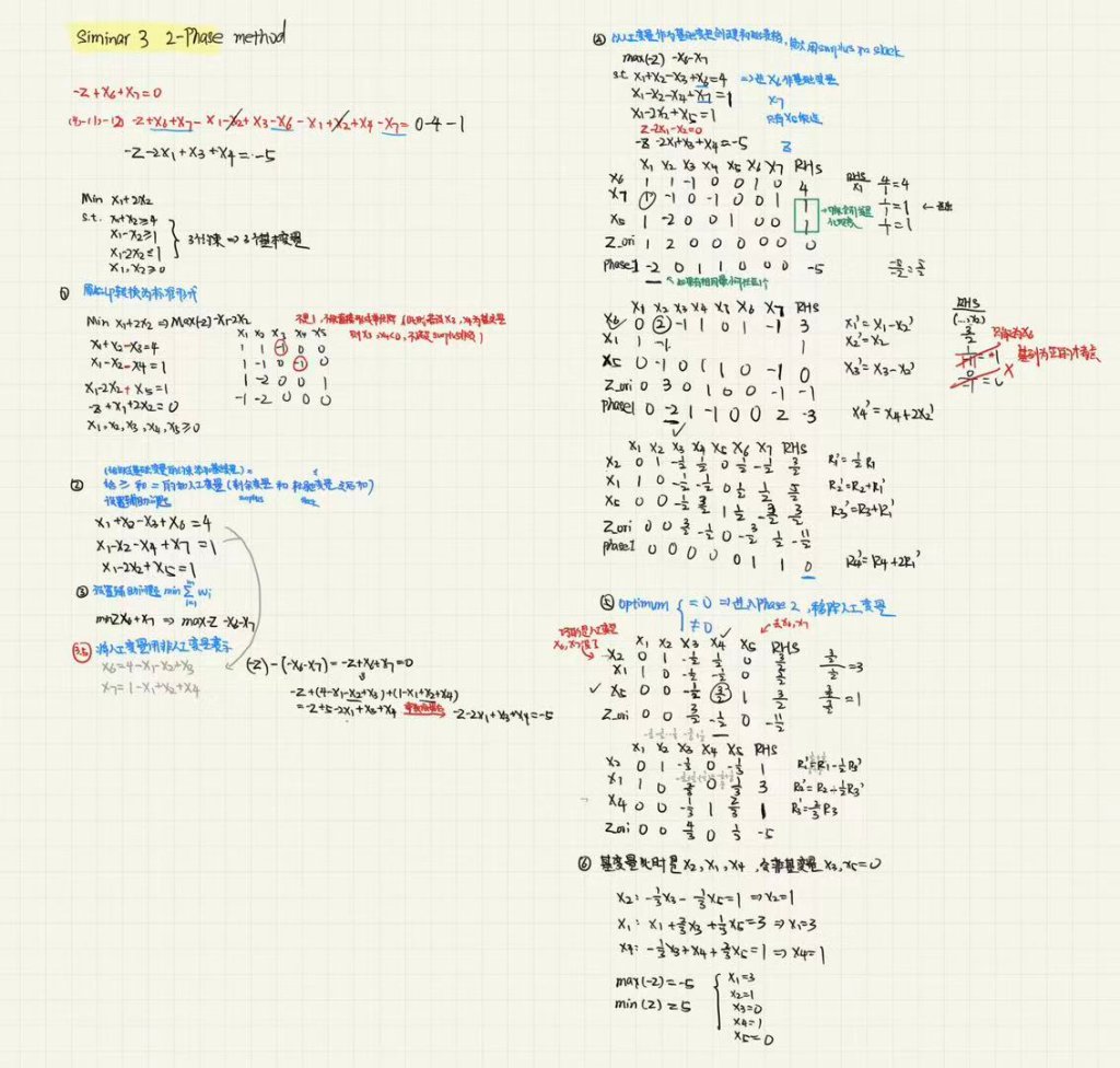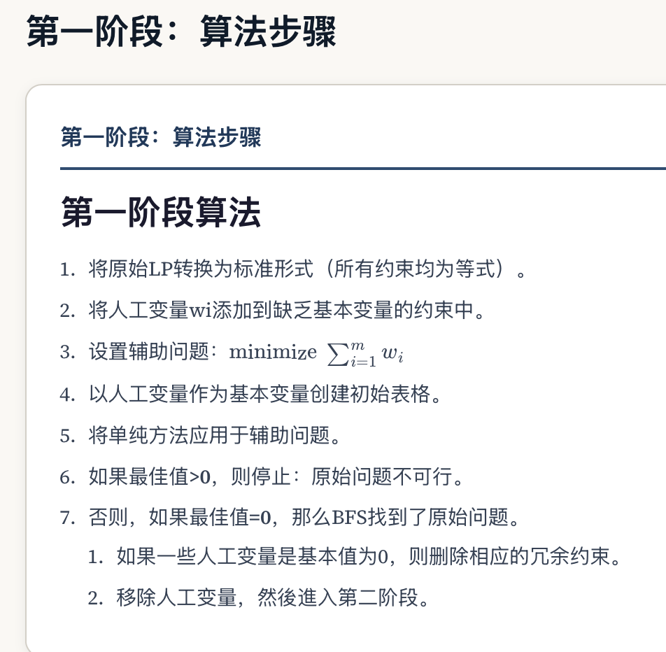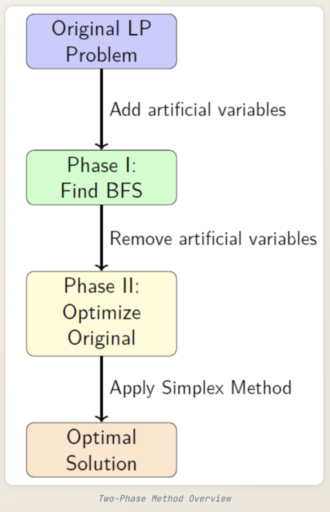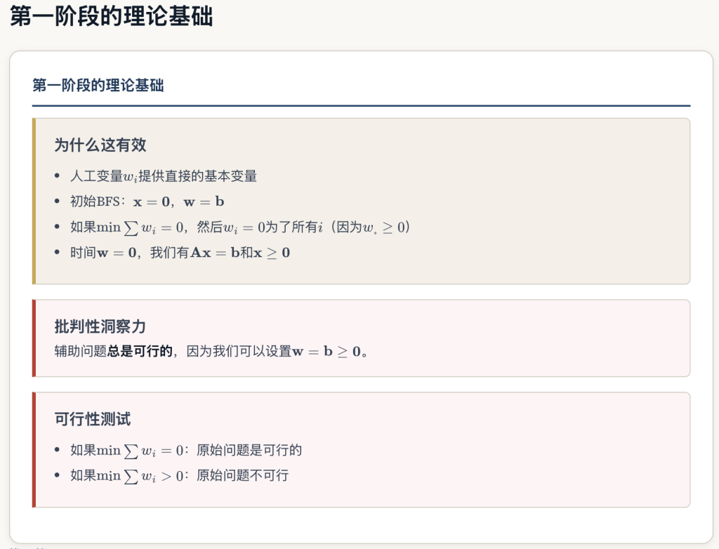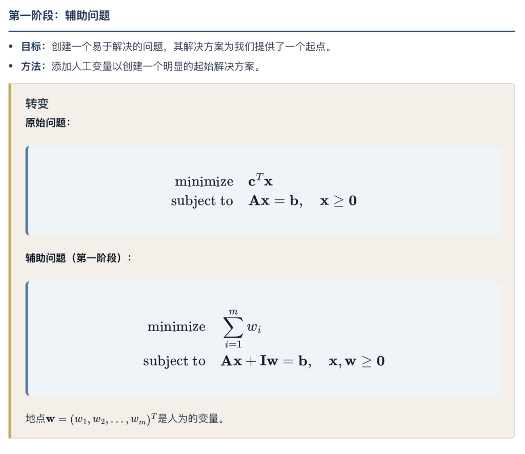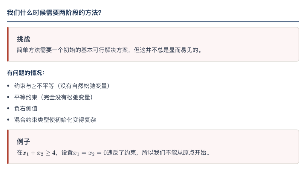 定义:两相法是在没有明显的初始基本可行解(BFS)时解决线性规划问题的系统技术