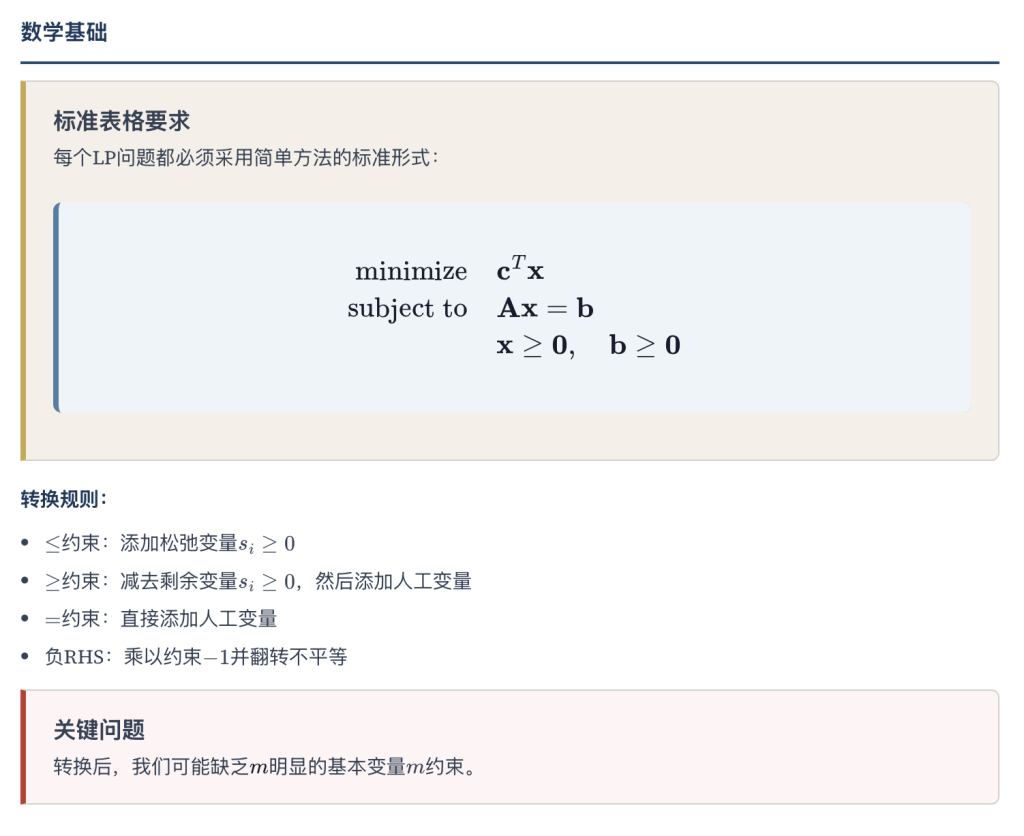 核心要求:每个等式约束中,需有且仅有一个系数为 1 的基变量,后续所有基可行解的求解均需满足这一要求。