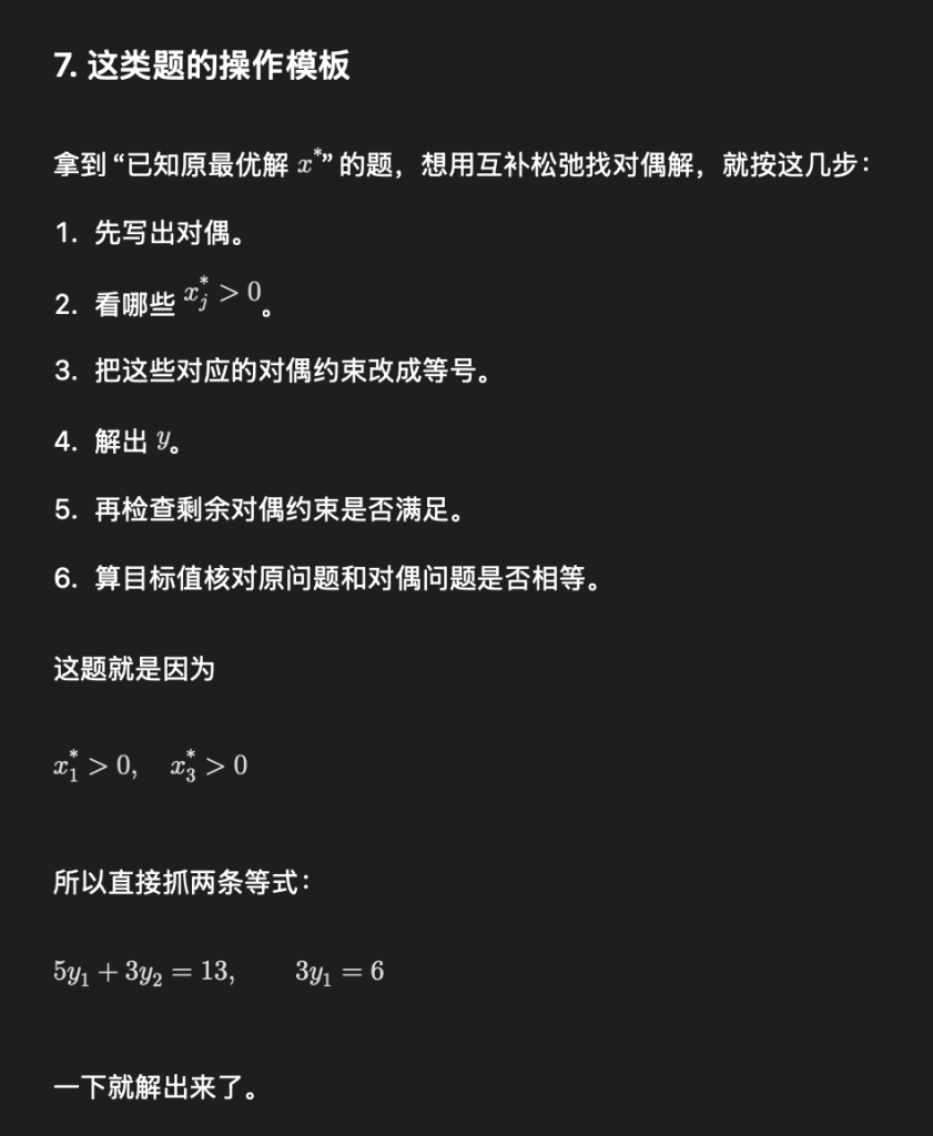 2. 最优解处,约束松弛 / 剩余与对应对偶变量乘积为 0(互补松弛)。