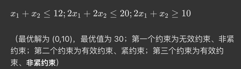 • 多数情况下(非全部),有效约束也是紧约束,一个约束可能对整个可行域是有用的,但在你当前这个点上并没有刚好取等号